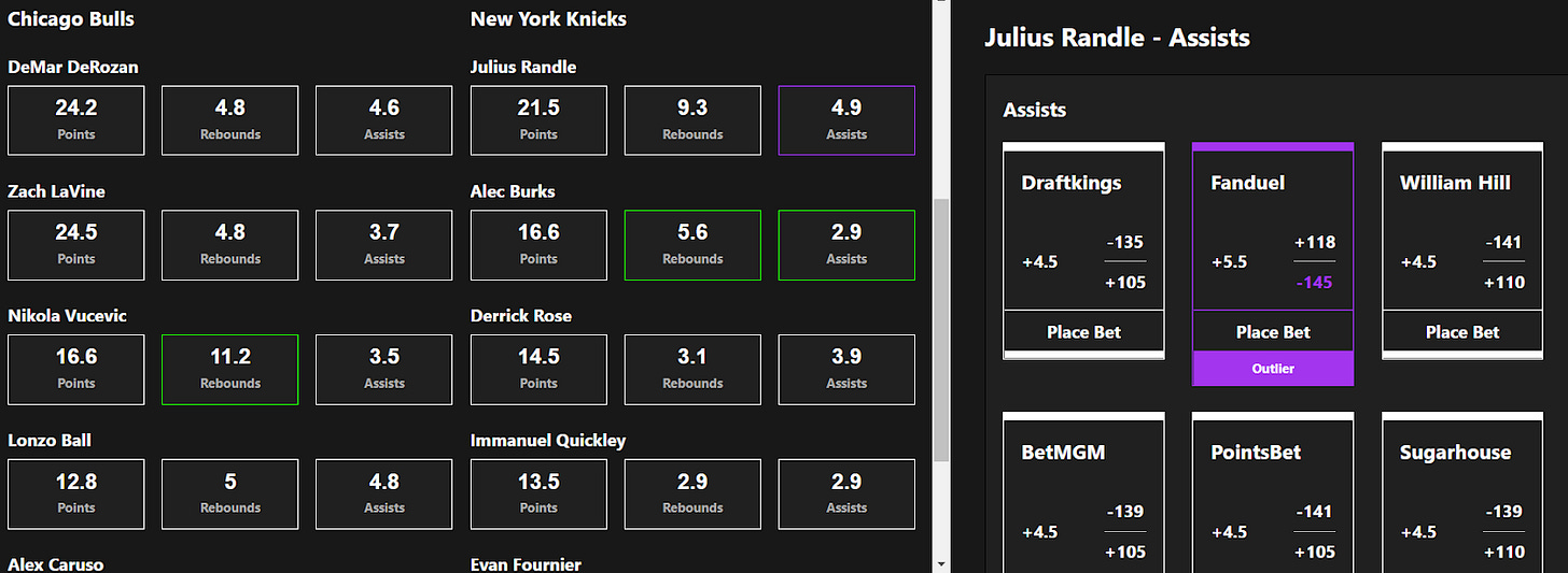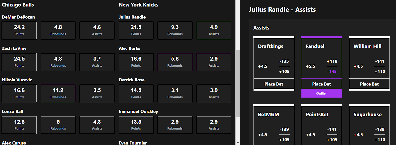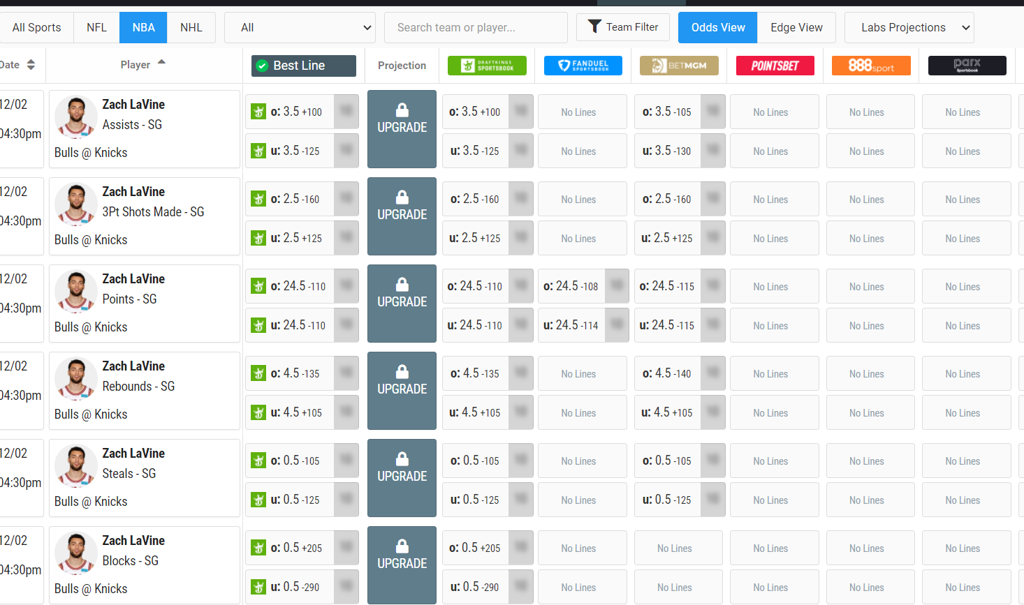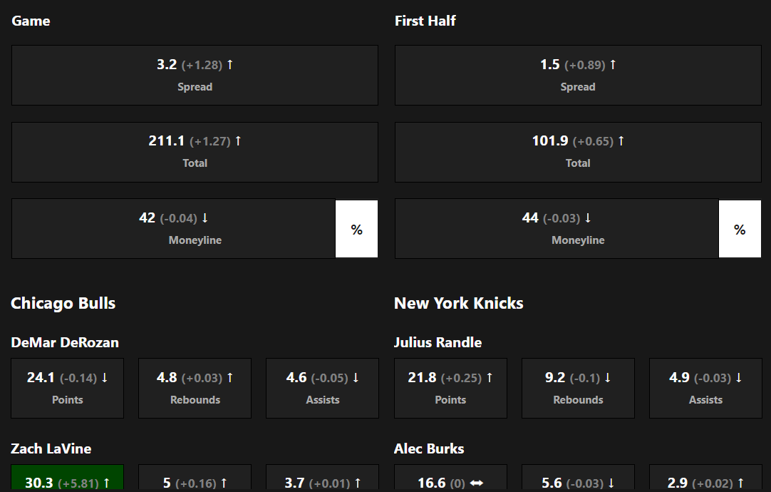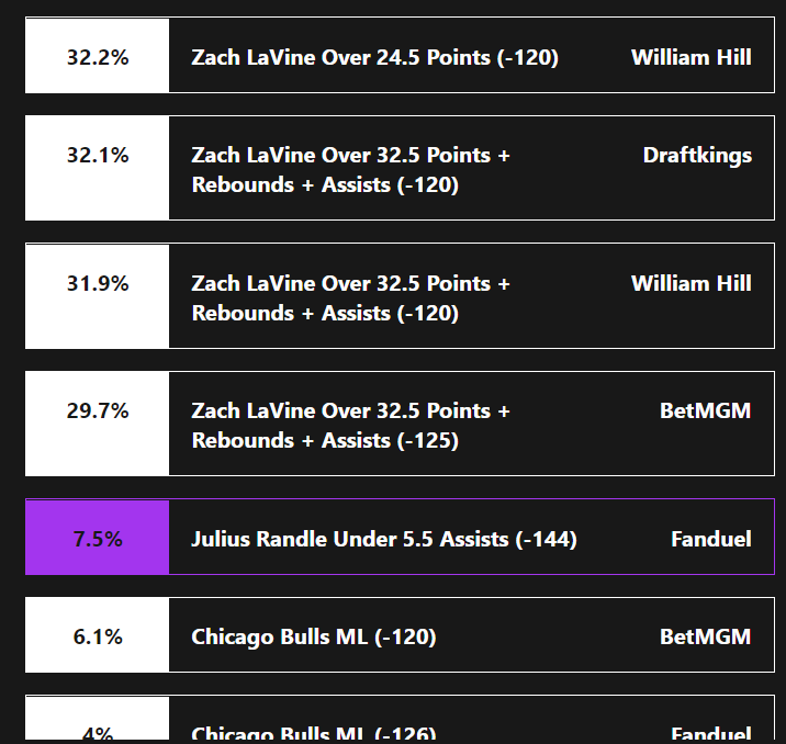 This is a sensible layout for a typical line shopping strategy. It’s easy to see which books are the best places to bet the spread/total on either side of the bet at each sportsbook, allowing you to zoom to the best price at all times. However, this line shopping approach has a very specific underlying assumption that is very limiting in maximizing your potential returns: that you already know what market you want to bet before you start comparing prices. Let’s say I wanted to bet on the Bulls in the above Bulls-Knicks game, because I thought Zach Lavine was due to go off. If I used this odds screen as my primary way of checking where I should place that bet, I would be missing out on so many other markets. What about team props for the Bulls? What about Lavine’s points props, which I also think should be higher? What about rebound markets for Knicks players, which should be lower if Lavine is scoring more? And what about other markets which may not even have a correlation to the angle I’m looking to bet, but whose cross-book price discrepancies are so large I can arbitrage and lock in a guaranteed profit? As we talked about in the last article, many of these markets have low synthetic hold, or even outlier lines at a single book that may offer a better price to a correlated outcome. If you limit yourself to line shopping in a single market, you’re foreclosing yourself to all of these other markets that offer a better avenue of attack for your beliefs.