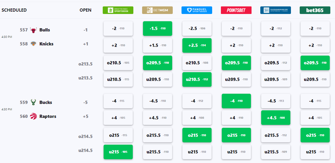 One concept I didn’t mention explicitly in the last article is “line shopping”, or searching for the best available line/price for the market you want to bet. Line shopping has been a foundational strategy for most sports bettors since online sports betting has been around; I don’t know a single professional bettor that doesn’t use it in some form, especially at the highest levels where your limiting factor is how much money you can get down in certain markets. Most of the odds comparison sites/tools today are an implicit endorsement of this strategy- which, again, is a good strategy if you know you are limited to these markets- and will have some variation of this layout: