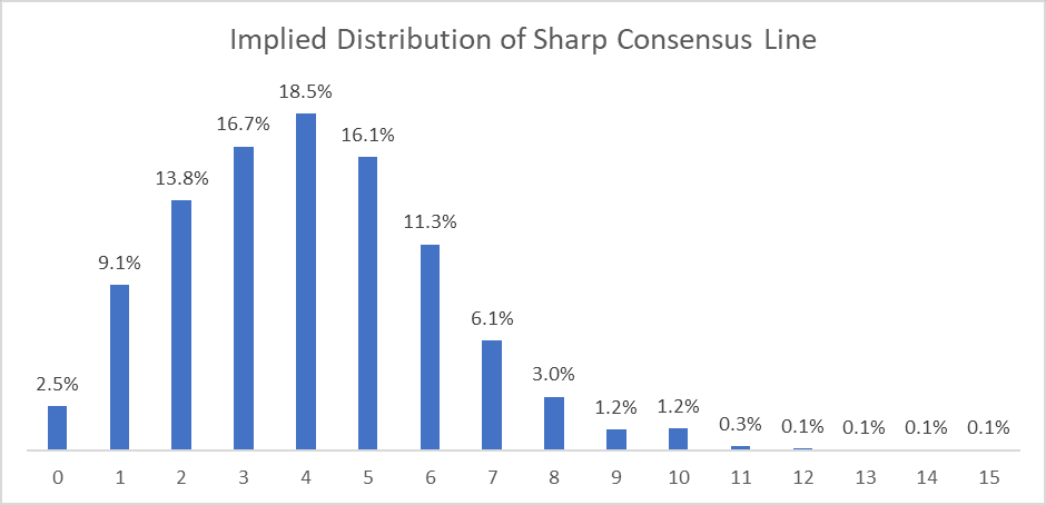 Again, assuming the Draftkings/MGM consensus line is the sharp consensus, here’s what we can assume our sharp distribution to be, one that satisfies the average line between the two: