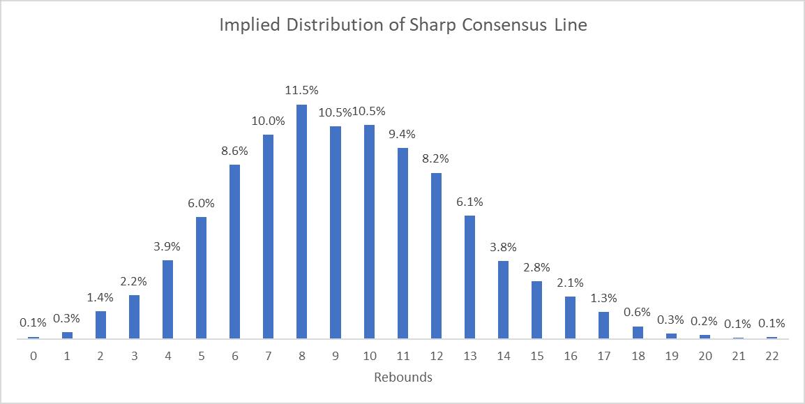First, let’s convert our sharp consensus line to a distribution. The vig-free probabilities for the over/under of 9.5 rebounds implied by the sharp consensus line are 54.4% under 9.5 rebounds, 45.6% over 9.5 rebounds. You can work to find a distribution that satisfies those conditions; we can think of it as our “sharp” distribution. Here’s what one such sharp distribution might look like: